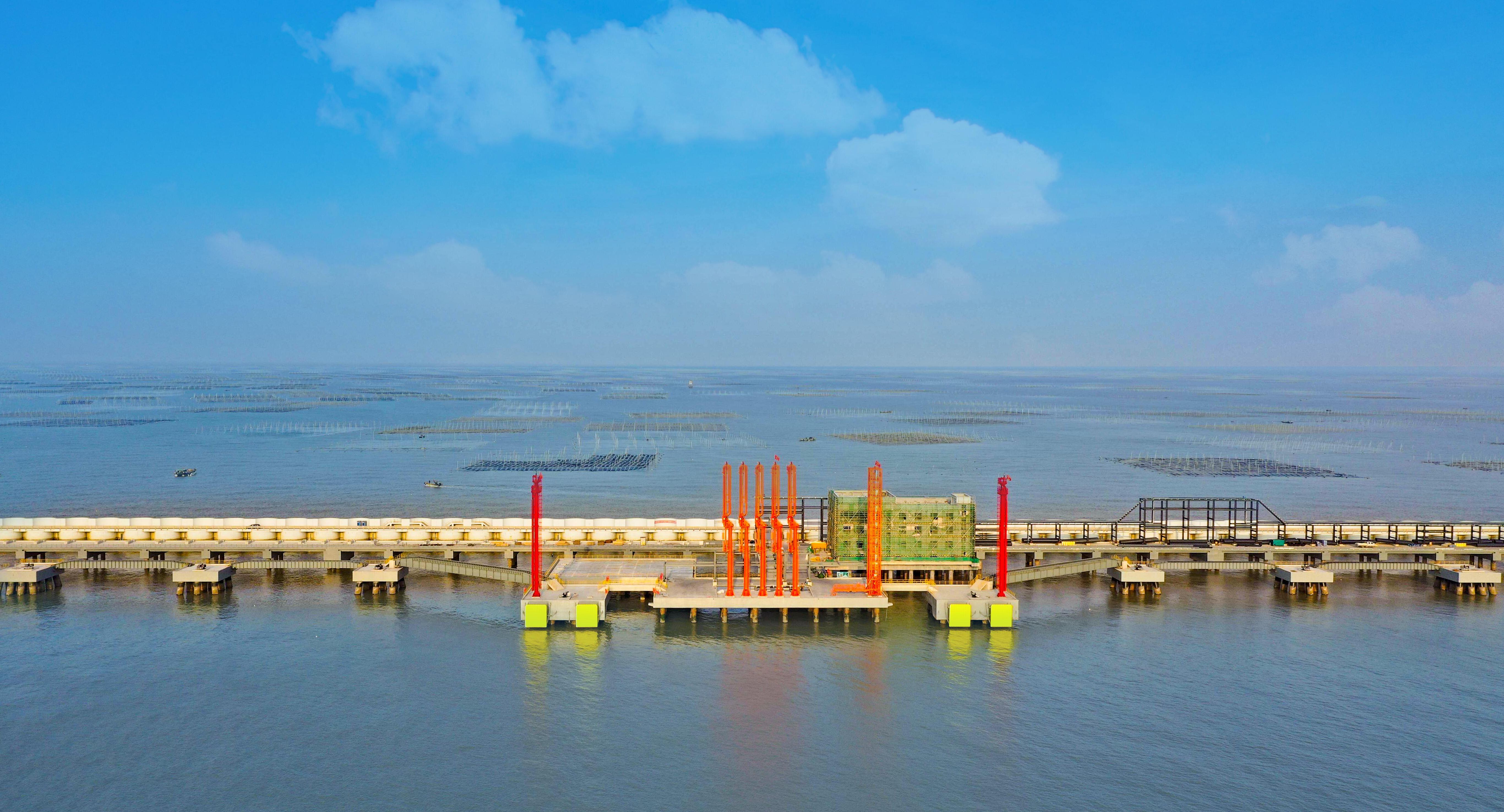 30萬噸級原油(yóu)泊位及4個(gè)5萬噸級液體散貨泊位橡(xiàng)膠護舷全部(bù)安裝完(wán)成,3棟消控樓主體結構完工(gōng);原油泊位管(guǎn)廊架完成,輸油臂、登船(chuán)梯、消防炮(pào)等大件設備全部安裝完成。
