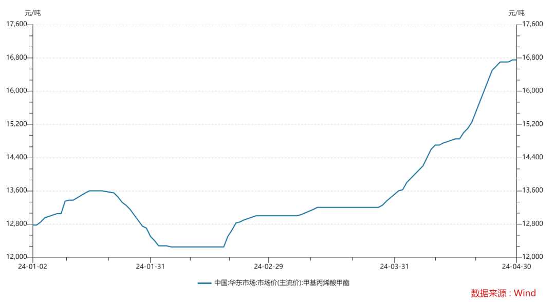 2024年以來,MMA價格進入明顯的上漲結構,4月份(fèn)開始進入急漲狀態(tài),價格創近5年新高,漲幅(fú)近60%。